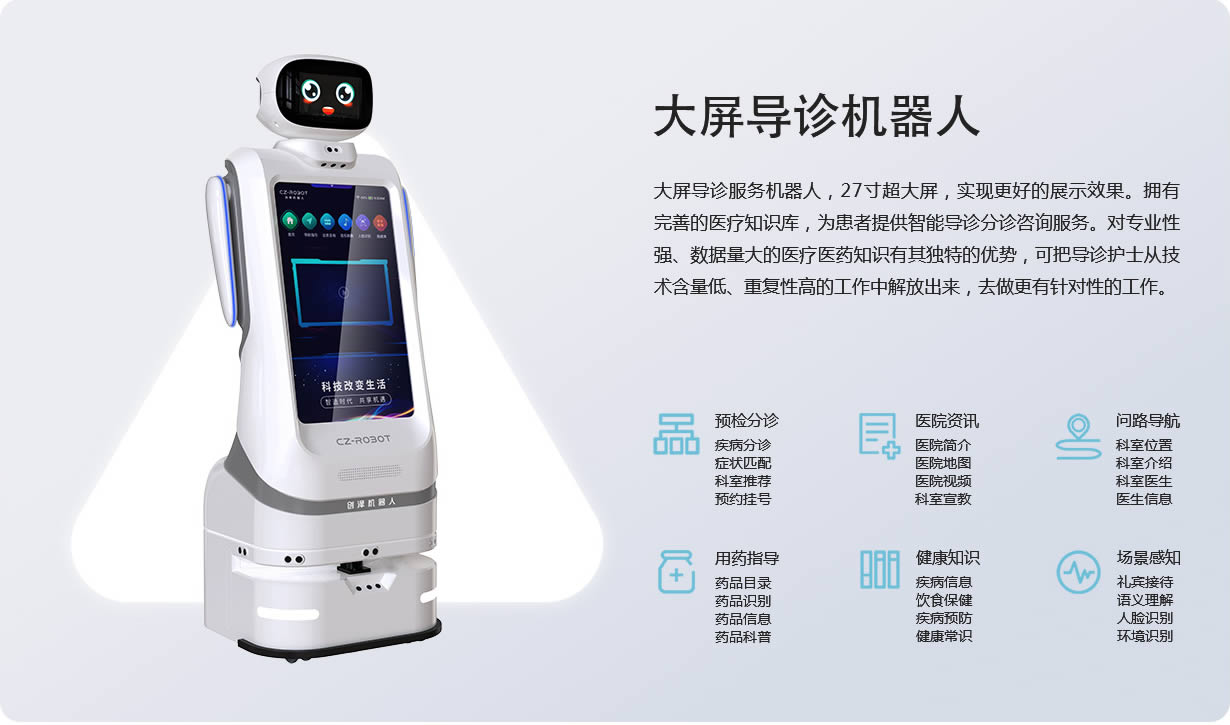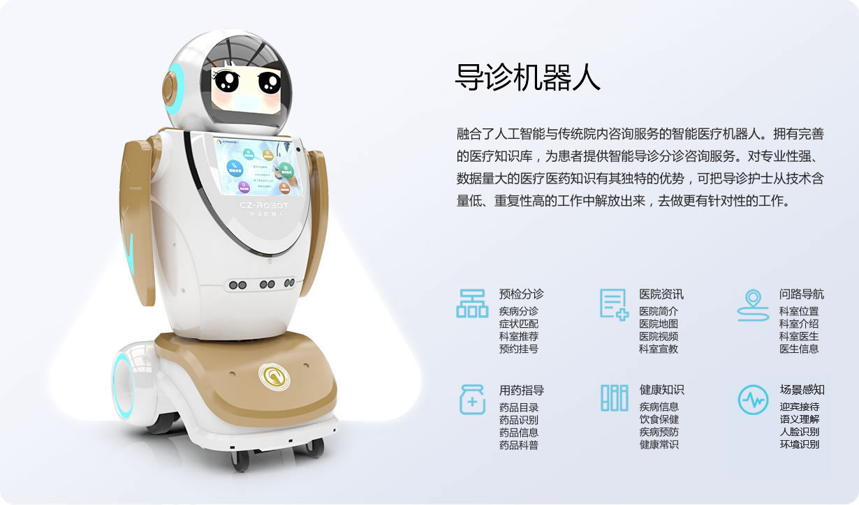 患者可以語(yǔ)音問(wèn)詢(xún)院內業(yè)務(wù)辦理方法、生活信息、業(yè)務(wù)對應科室、政策信息等常見(jiàn)問(wèn)題,支持人臉識別、迎賓接待等特色功能,可根據不同患者類(lèi)型進(jìn)行心理安撫。 |