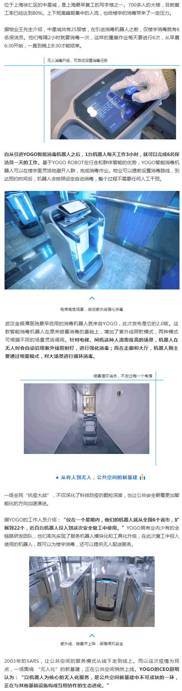 3月13日,L先的機器人企業(yè)YOGO ROBOT宣布,繼噴霧消殺機器人在疫區服役后,他們的新版智能消毒機器人,也將多面投入到復工企業(yè)的日常保衛戰中。