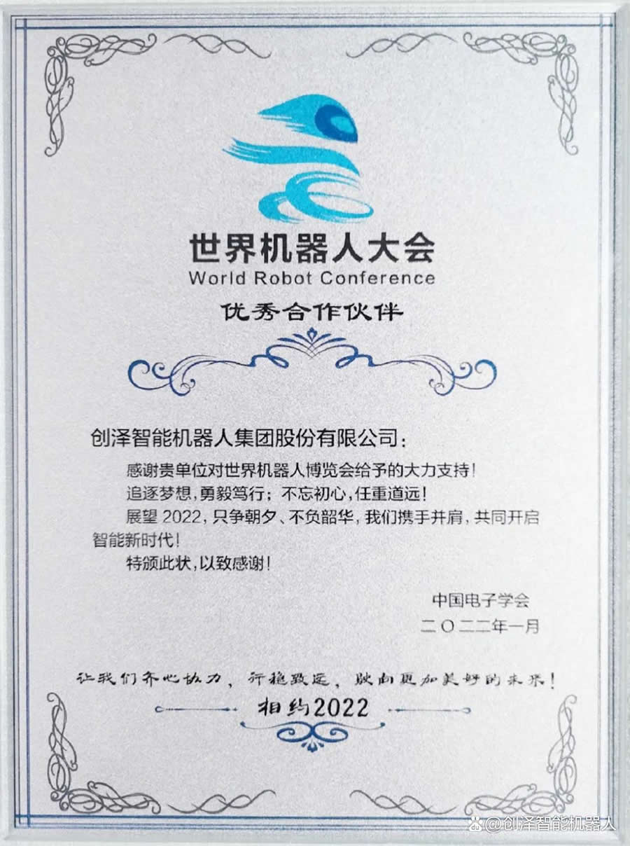 近日,創(chuàng )澤集團憑借多年的行業(yè)積累和持續的創(chuàng )新能力榮獲2021世界機器人大會(huì )“優(yōu)秀合作伙伴”稱(chēng)號。