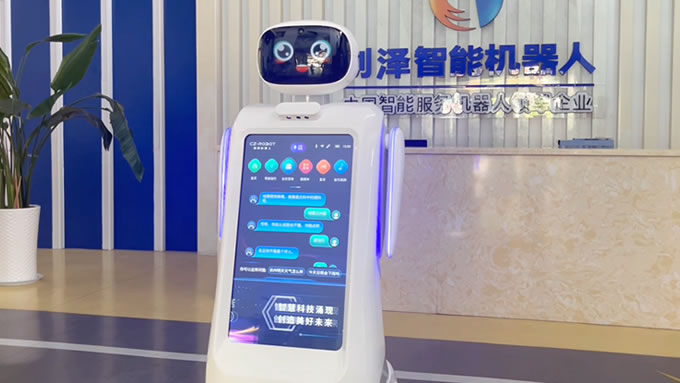 進(jìn)入園區內的展廳,可以遇到一臺服務(wù)接待機器人“創(chuàng )創(chuàng )”。