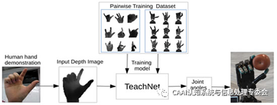 2019年,德國漢堡大學(xué)張建偉課題組和清華大學(xué)孫富春課題組共同提出TeachNet,一個(gè)直接從人類(lèi)手指深度圖獲取機器人關(guān)節角度的深度學(xué)習網(wǎng)絡(luò )[10]。這種方法只需使用一個(gè)深度相機,并實(shí)現端到端地控制機器人,是非常直觀(guān)和用戶(hù)友好的遙操作方法。TeachNet結合了一個(gè)一致性損失函數consistency loss,可以處理人手和機器手的外觀(guān)和內在結構差異。這個(gè)網(wǎng)絡(luò )的訓練依賴(lài)于一個(gè)合成的400K人手-機器手數據集,其中人手數據來(lái)自于人手位姿深度圖像數據集BigHand2.0,然后在Gazebo中采集對應每個(gè)人手的的機器手深度圖像。后,作者在5個(gè)不同操作者的抓取實(shí)驗中證明了TeachNet的穩定性和G效率。但是這種方法僅限于機器手的控制,無(wú)法移動(dòng)機械手使之在可達工作空間內進(jìn)行抓取。