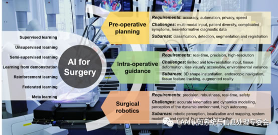 圖1:概述了流行的AI技術(shù),以及在術(shù)前規劃,術(shù)中指導和外科手術(shù)機器人學(xué)中使用的AI的關(guān)鍵要求,挑戰和子區域。