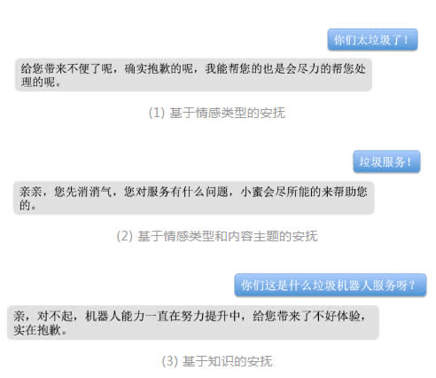 基于情緒類(lèi)別的情感回復,是只考慮用戶(hù)表達內容中的情緒因素而對用戶(hù)進(jìn)行相應的安撫回復。此回復方式是上述兩種回復方式的補充和兜底,同時(shí)回復的內容也會(huì )更加的通用。