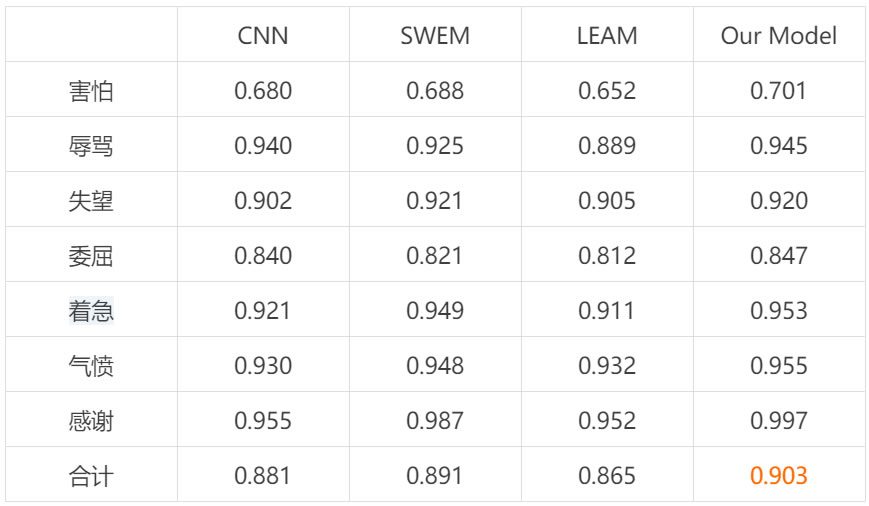 圖 5 給出了在線(xiàn)情感安撫的三個(gè)示例,分別對應上述的三種不同層面的回復機制。 表 2:需要安撫的情感分類(lèi)效果對比