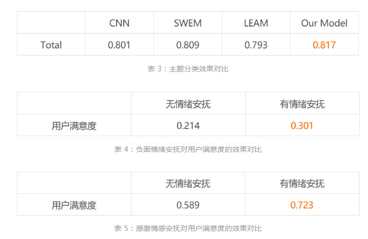 表 2 給出了針對需要安撫情感的分類(lèi)模型效果對比,包括每種情感類(lèi)別的單獨效果以及終的整體效果。表 3 給出了針對主題的分類(lèi)模型效果對比。表4給出了針對幾種負面情感,增加了情緒安撫之后,用戶(hù)滿(mǎn)意度的提升效果。表 5 給出了針對感激這種情感,增加了情緒安撫之后,用戶(hù)滿(mǎn)意度的提升效果。 表 3:主題分類(lèi)效果對比 表 4:負面情緒安撫對用戶(hù)滿(mǎn)意度的效果對比 表 5:感激情感安撫對用戶(hù)滿(mǎn)意度的效果對比