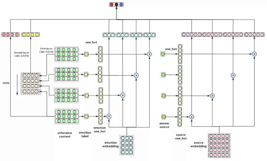 在本文中,我們提出了結合語(yǔ)義信息特征、情緒信息特征和答案來(lái)源信息特征的會(huì )話(huà)滿(mǎn)意度預估模型。模型充分考慮了會(huì )話(huà)中的語(yǔ)義信息,并且使用了數據壓縮的方式將情緒信息和答案來(lái)源信息進(jìn)行了充分表達。模型結構如圖 10 所示。