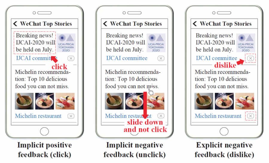 推薦系統在日常生活中被廣泛使用,為用戶(hù)獲取信息與娛樂(lè )提供便利。推薦系統算法往往基于用戶(hù)與系統的交互,這些交互行為可以大致分為以下兩類(lèi):顯式反饋與隱式反饋。顯式反饋從用戶(hù)對于物品的直接態(tài)度中獲取,例如評論中的一星到五星,或者微信看一看系統中的“不感興趣”按鈕。這類(lèi)反饋能夠直接表達用戶(hù)的正向以及負向偏好,但是這類(lèi)反饋的數量往往不多。隱式反饋從用戶(hù)的行為中間接獲得,例如用戶(hù)的點(diǎn)擊/不點(diǎn)擊行為。這些信息在推薦系統中往往是海量的,但是這些信息有著(zhù)較多噪聲(用戶(hù)點(diǎn)擊的并不一定是他真正喜歡的)。另外,隱式反饋通常是以正反饋的形式出現,推薦中的隱式負反饋存在巨大噪聲(未展現信息或者未點(diǎn)擊信息并不一定意味著(zhù)用戶(hù)不喜歡這些內容)。