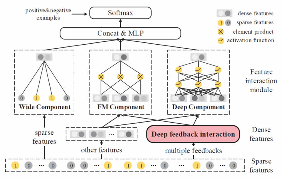 為了解決這些問(wèn)題,綜合使用用戶(hù)多種顯式/隱式和正/負反饋信息學(xué)習更好的無(wú)偏用戶(hù)表示,作者提出了一個(gè)Deep Feedback Network (DFN)模型。圖1中給出了在微信看一看場(chǎng)景中的三種用戶(hù)反饋。DFN通過(guò)internal feedback interaction component抓住用戶(hù)行為序列中的細粒度行為級別的交互,然后通過(guò)external feedback interaction component,使用準確但稀少的隱式正反饋和顯式負反饋作為監督,從噪音較多的隱式負反饋中進(jìn)一步抽取用戶(hù)的正負反饋信息。這些反饋特征會(huì )和其他用戶(hù)/物品特征混合,并行使用FM、Deep和Wide層進(jìn)行特征交互,后進(jìn)行CTR預估。