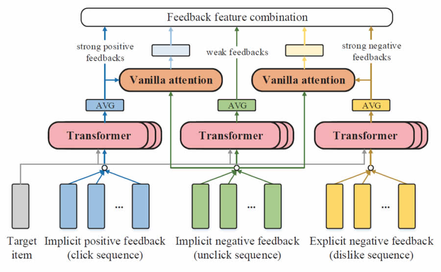 在推薦系統中,用戶(hù)的顯式反饋、隱式反饋、正反饋和負反饋都能夠反映用戶(hù)對于被推薦物品的偏好。這些反饋信息在推薦系統中十分有用。然而,現在的大規模深度推薦模型往往以點(diǎn)擊為目標,只看重以用戶(hù)點(diǎn)擊行為為代表的隱式正反饋,而忽略了其它有效的用戶(hù)反饋信息。