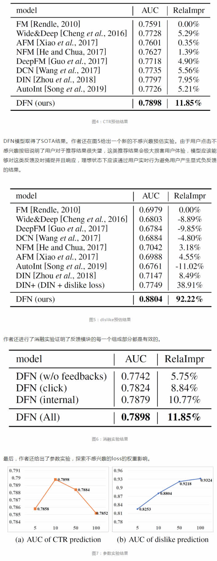DFN模型使用了internal feedback interaction component抓住用戶(hù)行為序列中的細粒度的行為級別的交互,然后通過(guò)external feedback interaction component,使用準確但稀少的隱式正反饋和顯式負反饋作為監督,從噪音較多的隱式負反饋中進(jìn)一步抽取用戶(hù)的正負反饋信息。在實(shí)驗中,作者基于微信看一看的數據,進(jìn)行了豐富的離線(xiàn)和在線(xiàn)實(shí)驗,模型與baseline相比均取得顯著(zhù)提升。