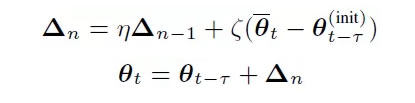 在基于 BMUF 的訓練框架下,假設我們總共有 N 個(gè)并行工作機,一個(gè)工作機可以是一塊或多塊 GPU 卡,也可以是一個(gè)計算節點(diǎn)。給定一個(gè)包含 Nτ 個(gè) minibatch 的訓練數據子集,首先我們將這些數據均勻分布到 N 個(gè)并行工作機,每臺工作機獲得 τ 個(gè) minibatch。從一個(gè)共同的初始模型 θ_(t-τ)^((init)) 開(kāi)始,N 個(gè)工作機獨立更新各自的局部模型 τ 步,得到 {θ_(t,1),θ_(t,2),…,θ_(t,N)},對局部模型取平均得到 θ ̅_t。這一過(guò)程稱(chēng)之為數據塊內并行優(yōu)化(Intra-Block Parallel Optimization, IBPO)。與直接將 θ ̅_t 作為全局模型不同,BMUF 技術(shù)將歷史更新信息與當前更新信息結合,得到全局模型: