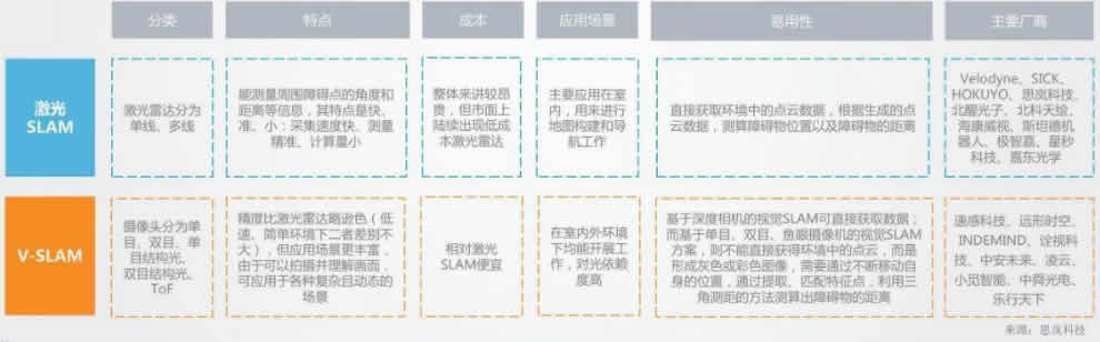 SLAM系統通常包含多種傳感器和多種功能模塊。按照核心的功能模塊區分,目前常見(jiàn)的機器人SLAM系統可分為兩種形式:基于激 光雷達的SLAM(激光SLAM)和基于視覺(jué)的SLAM(V-SLAM)。激光SLAM目前發(fā)展比較成熟、應用廣泛,未來(lái)多傳感器融合的SLAM 技術(shù)將逐漸成為技術(shù)趨勢,取長(cháng)補短,更好地實(shí)現定位導航。