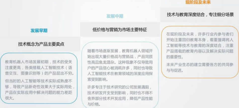 教育機器人經(jīng)歷了從概念先行到價(jià)格營(yíng)銷(xiāo)到回歸內容與價(jià)值本質(zhì)的發(fā)展階段變遷。