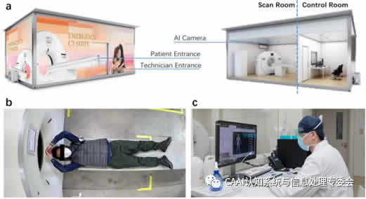 人工智能成像工作流程:許多現代的X光和CT系統都配備了用于病人監護的攝像機。在COVID-19爆發(fā)期間,這些設備促進(jìn)了非接觸掃描工作流程的實(shí)施。技術(shù)人員可以通過(guò)攝像機的實(shí)時(shí)視頻流從控制室監控病人。在這種情況下,人工智能能夠通過(guò)從視覺(jué)傳感器獲取的數據中識別患者的姿勢和形狀來(lái)自動(dòng)執行操作,以確定佳掃描參數。這樣的自動(dòng)化工作流程可以顯著(zhù)提G掃描效率并減少不必要的輻射暴露。一個(gè)顯著(zhù)的例子是基于由可視人工智能技術(shù)支持的移動(dòng)CT平臺自動(dòng)掃描工作流,如圖1(a)所示。移動(dòng)平臺完全獨立,帶有基于人工智能的預掃描和診斷系統。它被重新設計成一個(gè)完全隔離的掃描室和控制室,以避免技術(shù)人員和患者之間不必要的互動(dòng)。進(jìn)入掃描室后,通過(guò)視覺(jué)和聽(tīng)覺(jué)提示,指示患者在病床上擺好姿勢(圖1(b))。技術(shù)人員可以通過(guò)窗戶(hù)觀(guān)察,也可以通過(guò)掃描室內安裝在天花板上的人工智能攝像機傳輸的實(shí)時(shí)視頻,并在必要時(shí)校正病人的姿勢(圖1(c));颊叨ㄎ凰惴▽挠谜障鄼C[1]捕獲的圖像中自動(dòng)恢復患者的3D姿態(tài)和完全重建的網(wǎng)格;3D網(wǎng)格,患者目標身體部分的掃描范圍和3D中心線(xiàn)都被估計并轉換成控制信號和優(yōu)化的掃描參數,以供技術(shù)人員驗證。一旦核實(shí),病床將自動(dòng)對準ISO中心,并移入掃描架進(jìn)行掃描。采集到CT圖像后,將對其進(jìn)行處理和分析,以便進(jìn)行篩查和診斷。2、AI圖像增強在COVID-19中的具體應用