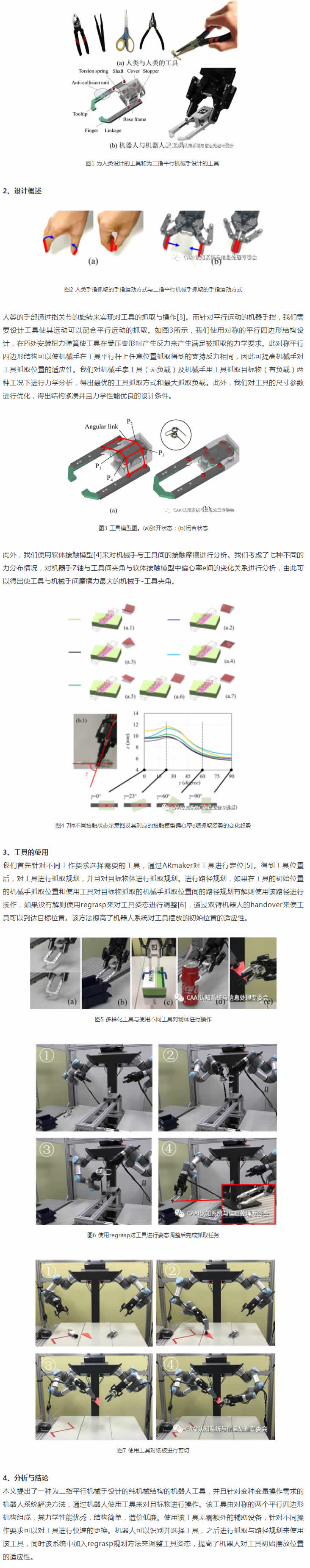 現代自動(dòng)化生產(chǎn)中要求機器人系統具備一定柔性以適應變種變量的生產(chǎn)需求。例如在機器人分揀及組裝中,機器人需要快速處理各式不同的物體。使機器人系統可以穩定并且低成本的操控多種目標物體是實(shí)現新一代G效自動(dòng)化生產(chǎn)的重要研究目標。目前機器人系統針對多種物體的操作,主要通過(guò)機械手/手指更換設備或多功能機械手來(lái)實(shí)現[1][2]。然而機械手/手指更換設備需要部署輔助控制設備和外部能源供給,這增加了系統的復雜度。同時(shí),設備的控制與供能需要引入電纜或氣管,這會(huì )對機械臂的自由靈活運動(dòng)產(chǎn)生干擾。此外,多功能機械手僅可適用于一定范圍的操作任務(wù)。對此,我們提出了讓機器人使用不同工具來(lái)操作多樣化目標物的方法。這里提到的工具并不是機器人學(xué)中對終端執行器的稱(chēng)呼,而是同人類(lèi)使用的鑷子,剪刀等工具一樣的可以被機械手直接控制的工具。此工具為復雜的變種變量的操作任務(wù)提供了一項有效的解決方案,它有如下特征:(1) 通過(guò)機械機構實(shí)現機械手到工具的動(dòng)力傳遞,無(wú)需外部控制及供能;(2)結構緊湊,對機器人的避障路徑規劃影響J;(3) 通過(guò)設計不同的工具先端實(shí)現可以對多種任務(wù)進(jìn)行有效配適,在更換工具時(shí)僅需要對目標工具進(jìn)行一次抓;(4)純機械機構設計,成本低廉,可靠性強。