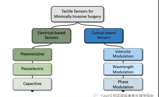 應用于MIS的觸覺(jué)傳感器主要是基于電學(xué)或光學(xué)原理開(kāi)發(fā)的。圖1顯示了基于傳感原理的MIS觸覺(jué)傳感器的種類(lèi)。