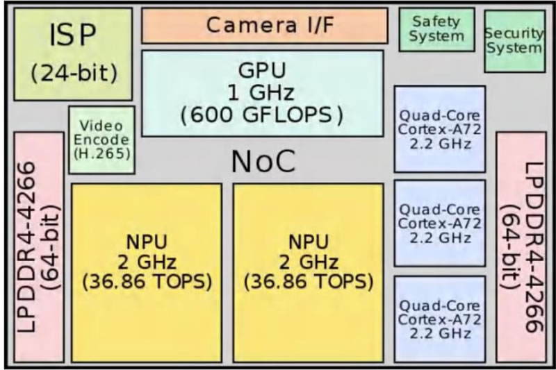 層出發(fā)為自動(dòng)駕駛和深度神經(jīng)網(wǎng)絡(luò )鎖設計的芯片,CPU做控制,GPU做圖像處理,NPU為神經(jīng)處理單元,