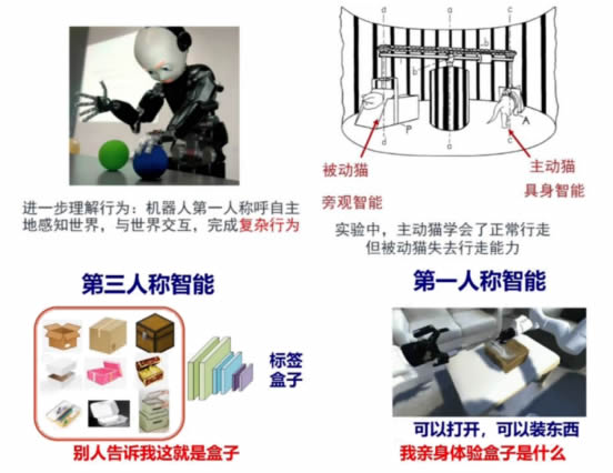 智能受腦、身體與環(huán)境協(xié)同影響,側重智能體與環(huán)境的“交互”,利用行為實(shí)現學(xué)習。從認知的角度來(lái)看,人類(lèi)為D一人稱(chēng) 視角的智能,以1963年的一個(gè)實(shí)驗為例,被綁起來(lái)的貓,只能看這個(gè)世界,是一種旁觀(guān)的智能;另一只貓可以主動(dòng)去探索,是 具身的智能。前者有點(diǎn)像現在基于大量數據的智能,比如我們給機器很多盒子,并且標注這就是盒子,然后機器就會(huì )覺(jué)得這種 pattern 是盒子,屬于第三人稱(chēng)的智能,而我們人類(lèi)是通過(guò)體驗才知道的。具身智能基于智能體具身行為的學(xué)習機制可以將數據 的采集、模型的學(xué)習融為一體,真正實(shí)現主動(dòng)交互的學(xué)習,這也是對人類(lèi)學(xué)習過(guò)程的更G級模擬。