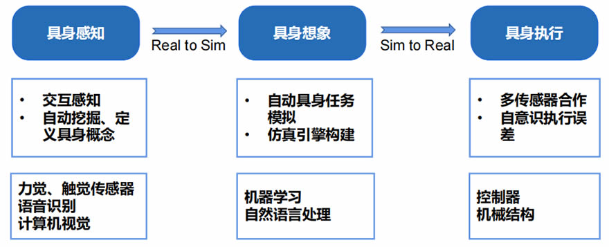 1 具身感知(Perception):通過(guò)視覺(jué)、觸覺(jué)等傳感器交互感知,構建模型,定義、獲取、表達可以被機器人使用的具身概念。