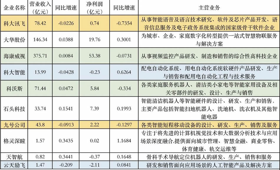 依然以營(yíng)收和凈利潤兩個(gè)指標來(lái)界定,4家雙增的企業(yè)有大華股份、石頭科技、格靈深瞳、天智航;2家雙降的企業(yè)有科大訊飛、九號公司;4家單降的企業(yè)有?低、科大智能、科沃斯、云天勵飛。