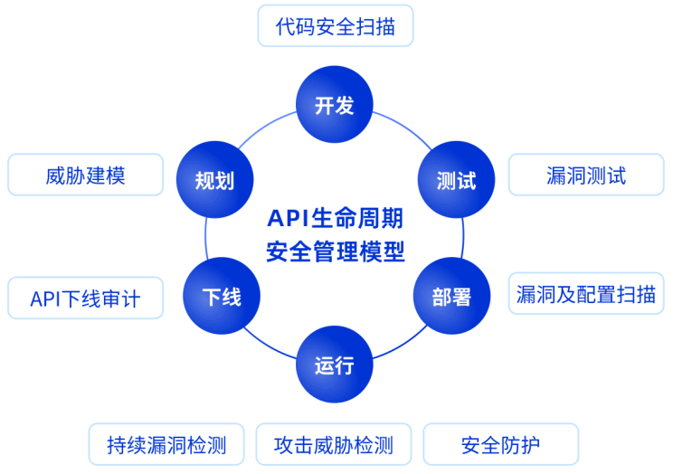 其次,API在整個(gè)業(yè)務(wù)生命周期當中變化非?,API實(shí)現邏輯一旦發(fā)生變化,很容易引入新的風(fēng)險。因此,從API全生命周期來(lái)考慮API安全,圍繞規劃、開(kāi)發(fā)、測試、部署、運行到下線(xiàn)的每一個(gè)環(huán)節加強安全建設顯得尤為重要。