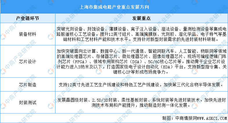 上海市將集成電路產(chǎn)業(yè)作為核心先導。到2025年,上海集成電路產(chǎn)業(yè)規模實(shí)現倍增,將形成國際出色、技術(shù)先進(jìn)、產(chǎn)業(yè)鏈完整、配套完備的集成電路產(chǎn)業(yè)體系,基本建成具有影響力的集成電路產(chǎn)業(yè)創(chuàng )新G地。未來(lái),上海市集成電路產(chǎn)業(yè)重點(diǎn)發(fā)展方向如下: