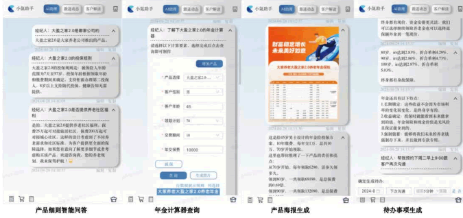 保險AI大模型助手已成功嵌入超過(guò)百款保險產(chǎn)品,并支持自動(dòng)解讀保險條款,能夠針對涉及產(chǎn)品條款和年金計算等復雜問(wèn)題進(jìn)行實(shí)時(shí)響應。通過(guò)保險AI大模型助手的應用,可以實(shí)現以下效益: