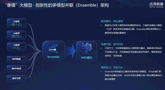 系統應用BERT、GPT或其變體等先進(jìn)的NLP大模型,以及知識圖譜、業(yè)務(wù)規則,結合達觀(guān)數據“曹植”大模型做多模型并聯(lián)結合?蓳碛袕臄祪|到超過(guò)一百億的參數量,使其能夠有效地處理和分析大量該公司歷來(lái)文本數據,用于客服問(wèn)答、知識管理、制度管理、知識搜索等任務(wù)。