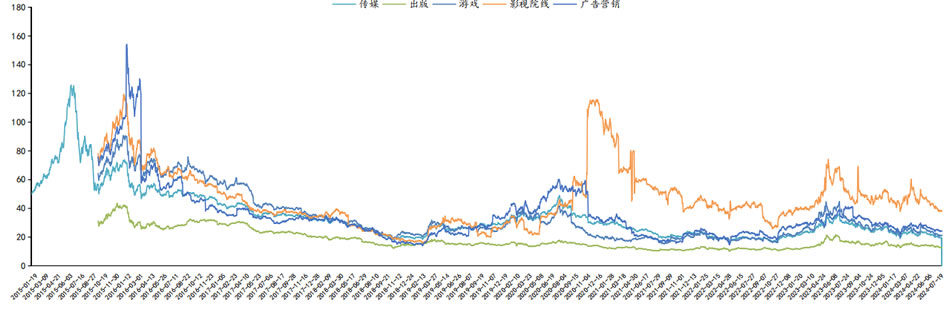 2024年1月2日至7月19日,傳媒(申萬(wàn))板塊下跌-23.86%,同期滬深300指數漲幅4.51%,傳媒(申萬(wàn))板塊跑輸大盤(pán)28.37%。細分行業(yè)中,出版/ 游戲/廣告營(yíng)銷(xiāo)/影視院線(xiàn)板塊漲跌幅分別為-13.44%、-27.76%、-23.34%、-22.82%。受宏觀(guān)經(jīng)濟波動(dòng)帶來(lái)的投資不確定性與技術(shù)進(jìn)步導致的行業(yè) 間競爭加劇影響,傳媒行業(yè)2024年上半年行情表現有所回落。