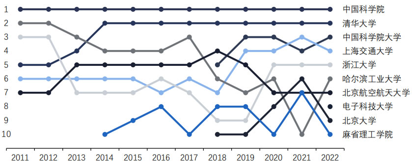 中國機構在人工智能論文發(fā)表數量前十中占據九席,中科院常年位列D一