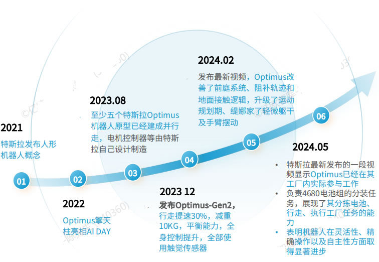2023 年 特斯拉發(fā)布Optimus-Gen2演示視頻, 其運動(dòng)能力、平衡性與感知能力進(jìn)—步提升,能夠實(shí)現二指拿雞蛋等動(dòng)作,指尖觸覺(jué)傳感器與足部力傳感器的應用成為核心亮點(diǎn)。特斯拉人形機器人目前放在特斯拉汽車(chē)工宇進(jìn)行實(shí)用性測試優(yōu)化,馬 斯克在2023第四季度業(yè)績(jì)交流會(huì )提出2025年實(shí)現人形機器人部分交付,將持續推動(dòng)商業(yè)化落地。