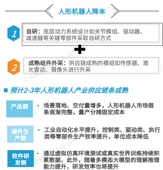 人形機器人降本是確定趨勢,供應鏈成熟與否是實(shí)現降本重中之中,未來(lái)人形機器人產(chǎn)業(yè)供應鏈也會(huì )趨向智能手機發(fā)展,達到生態(tài)成熟、規模量產(chǎn) 且成本可控的狀態(tài)。