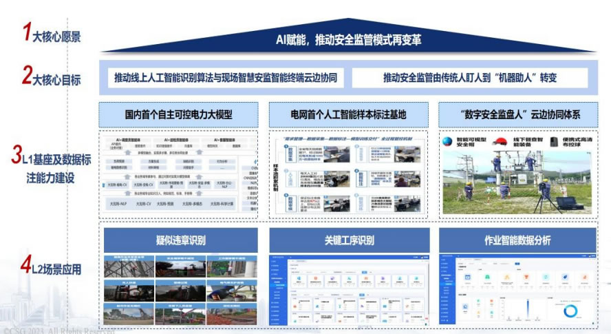 基于公司大瓦特生態(tài)技術(shù)體系,推動(dòng)安全監管模式再變革 1 大核心愿景,細化 2 大核心目標,依托大瓦特 L0 電力基礎大模型、電網(wǎng)人工智能樣本標注基地、“數字安全監盤(pán)人”功能L先為 3 大核心基礎,構建疑 似違章識別、關(guān)鍵工序識別、作業(yè)智能數據分析等 3 大核心功能的人工智能推動(dòng)安監模式變革建設“1234”總體框架。