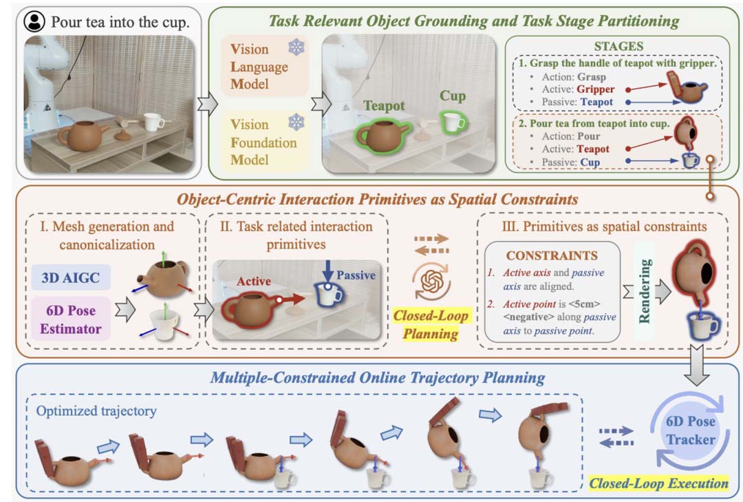 以物體為中⼼的交互基元作為空間約束:通過(guò) 3D 基座模型⽣成任務(wù)相關(guān)物體的 3D 模型和規范化空間(canonical space),使 VLM 能夠直接在該空間中采樣 3D 交互基元,作為 Action 的空間約束,從⽽優(yōu)化求解出 Active 物體在 Passive 物體規范坐標系下的⽬標交互姿態(tài)。