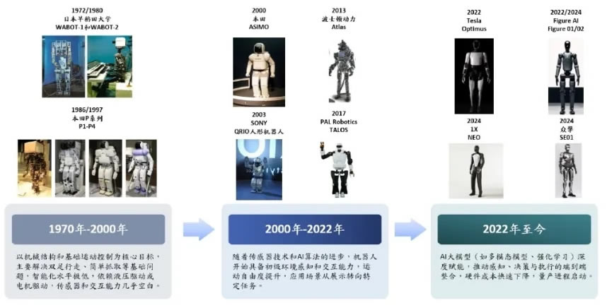 人形機器人技術(shù)的探索歷程可追溯至20世紀中期。1972年,日本早稻田大學(xué) 研發(fā)出世界上D一款全尺寸人形智能機器人WABOT-1, 開(kāi)啟了人形機器人技術(shù) 的先河。1990年代,隨著(zhù)研究方向的創(chuàng )新以及控制方法、人工智能等L域的突 破,人形機器人技術(shù)迎來(lái)了快速發(fā)展期。2000年,本田推出ASIMO 機 器 人 , 其運行功能的逐步完善標志著(zhù)人形機器人技術(shù)邁上了新的臺階。此后,人形機 器人在環(huán)境感知、決策、學(xué)習和運動(dòng)控制等方面不斷迭代升級,性能顯著(zhù)提 升。2018年,本田因市場(chǎng)需求、業(yè)務(wù)調整等因素宣布停止ASIMO 的研發(fā)。 2020年軟銀旗下的D機器人技術(shù)公司波士頓動(dòng)力出售給韓國現代汽車(chē)集 團,收購作價(jià)為11億美元,估值相比2013年谷歌收購波士頓動(dòng)力時(shí)的30億美 元下降了約63%。然而,行業(yè)技術(shù)發(fā)展的腳步并未停滯。2022年,特斯拉推出 Optimus 機器人,引L了新一輪人形機器人的研發(fā)熱潮。與此同時(shí),人工智能 的快速進(jìn)步為人形機器人的研發(fā)注入了新的動(dòng)力。