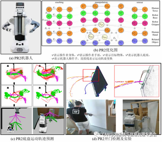 Personal Robot 2(PR2)[5]是Willow Garage開(kāi)發(fā)的移動(dòng)式操作機器人平臺(如圖2(a)),它配備兩個(gè)兼容7自由度機械臂和機械手,在頭部、胸部、肘部、夾爪上分別安裝有G分辨率攝像頭、激光測距儀、慣性測量單元、觸覺(jué)傳感器等豐富的傳感設備,通過(guò)底部的四輪移動(dòng)平臺可無(wú)限擴展其作業(yè)范圍,提供基于Ros系統的仿真環(huán)境,可模擬開(kāi)門(mén)、打臺球和畫(huà)畫(huà)等復雜操作,適用于科研的實(shí)驗平臺。Welschehold[6]在PR2實(shí)現了從人的開(kāi)門(mén)操作動(dòng)作示教中學(xué)習移動(dòng)底盤(pán)的運動(dòng)方式以及夾持器的操作姿態(tài),作者將機器人的學(xué)習分為三個(gè)部分的軌跡預測包括示教者的手部運動(dòng)軌跡、示教者的身體移動(dòng)軌跡以及被操作物體的運動(dòng)軌跡,后通過(guò)超圖優(yōu)化方式的來(lái)預測機器人底盤(pán)運動(dòng)和操作機械臂的運動(dòng)軌跡(如圖2(b)-(d))。