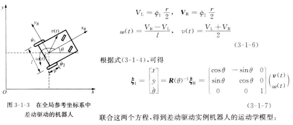 先,我們討論如圖3-1-3所示的雙輪差速驅動(dòng)的移動(dòng)機器人的運動(dòng)學(xué)模型, 即討論給定機器人的幾何特征和它的輪子速度后,機器人的運動(dòng)方程。