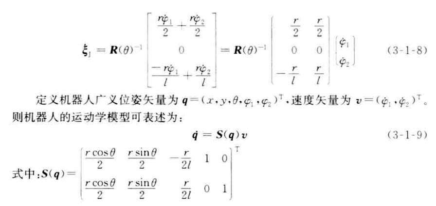 假定機器人在運動(dòng)中質(zhì)心的線(xiàn)速度為v(t), 角速度為w(t), 左右兩輪的轉速分別為ψ和 中₂,機器人左右兩輪的運動(dòng)速度分別為 VI, VR。給定r,1,θ, 以及根據圖3-1-3所示的幾 何關(guān)系,考慮到移動(dòng)機器人滿(mǎn)足剛體運動(dòng)規 律,下面的運動(dòng)學(xué)方程(3-1-6)成立。