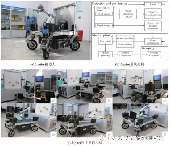 Jupiter[13]汕頭大學(xué)范衠團隊研制的移動(dòng)操作機器人,該移動(dòng)機器人由四輪獨立轉向的底盤(pán)和UR5機械臂組成(如圖6(a))。通過(guò)2D激光雷達信息采用Hector SLAM實(shí)現機器人對地圖的感知和自主導航規劃,通過(guò)D部的RGB-D相機采集目標物體深度和RGB圖像信息,并通過(guò)SSD網(wǎng)絡(luò )檢測目標物體,通過(guò)坐標轉換2D坐標轉換為三維空間坐標,后通過(guò)UR5機械臂進(jìn)行抓取實(shí)驗(如圖6(b))。通過(guò)實(shí)驗測試,機器人單次完成導航、識別、抓取和放置的全流程需要大約212s,對單目標的抓取成功率可達98%(如圖6(c))。