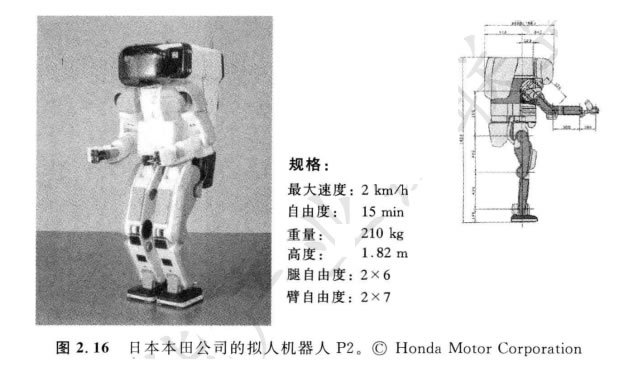 本田公司的擬人機器人項目有著(zhù)值得注意的發(fā)展經(jīng)歷。但是此外,它還抓住了 激勵的非常重要的工程挑戰。圖2.16展示了模型 P2, 它是Z新模型 Asimo (在發(fā)明 移動(dòng)性中有超前步伐)Z直接的先驅。注意,Z新的本田 Asimo 模型仍然比 SDR- 4X I大得多,高120 cm, 重52 kg 。這可在保持不危險尺寸和姿勢的同時(shí),能在有樓 梯和臺階的人類(lèi)環(huán)境中具有實(shí)用的機動(dòng)性。也許這是展示仿生的雙腳上下樓梯的第 一個(gè)機器人。這些本田擬人系列的機器人不是專(zhuān)門(mén)為娛樂(lè )目的而設計,而是作為整 個(gè)社會(huì )的人類(lèi)幫手而設計。例如,本田公司把Asimo 的高度當作機器人能對人類(lèi)環(huán) 境進(jìn)行管理操作(如控制燈開(kāi)關(guān))的Z小高度。