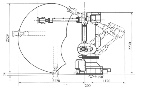 以持重100kg, Z高速度4m/s 的六軸垂直多關(guān)節(jié)機器人為例,其規(guī)格性能如圖6-1及 表6-2所示,這是一種典型的點焊機器人,可勝任大多數(shù)車體裝配工序的點焊作業(yè)。由于使 用中幾乎全部用來完成間隔為30~50mm 的打點焊接作業(yè),運動中很少能達到Z高速度, 因此,改善Z短時間內(nèi)頻繁短節(jié)距啟動、制動的性能是本機追求的重點。為了提高加速度和減速度,在設(shè)計中注意減輕手臂的重量,增加驅(qū)動系統(tǒng)的輸出力矩。