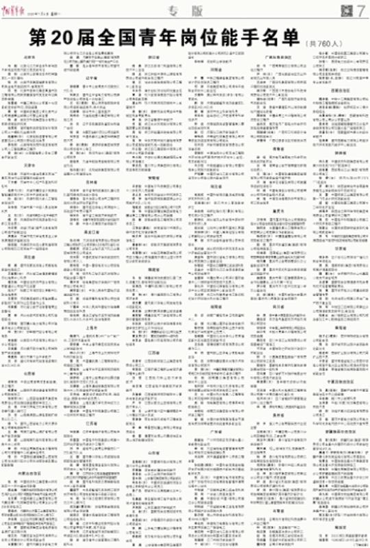 新疆青年崗位能手名單:白軍 賽福丁·伊斯熱依力 張秉忠 楊向陽(yáng) 梁邦偉 唐永亮 鄭九順 趙強國 殷文娟