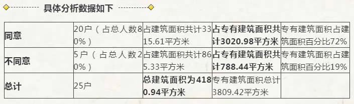 2016年1月10日,湛江市霞山區某小區就召開(kāi)了業(yè)主大會(huì ),并作出決議,確認該小區業(yè)主共有66戶(hù),其中同意加裝小區電梯的業(yè)主數為52戶(hù)(東門(mén)總共25戶(hù),其中20戶(hù)同意加裝;中門(mén)總共17戶(hù),其中9戶(hù)同意加裝;西門(mén)總共24戶(hù),其中23戶(hù)同意加裝),該小區業(yè)主大會(huì )會(huì )議決定:在該小區東門(mén)、西門(mén)各加裝一臺電梯。2016年11月18日,根據該小區的申請,湛江規劃局依法頒布了在該小區東門(mén)、西門(mén)各加裝一臺電梯的《建設工程規劃許可證》。小區西門(mén)的電梯安裝較為順利,但東門(mén)不同意安裝的5位業(yè)主對在東門(mén)安裝電梯的工程實(shí)施中百般阻撓,將車(chē)輛停放在施工現場(chǎng)以阻礙施工。經(jīng)派出所、社區法律顧問(wèn)等多方調解無(wú)效后,2017年9月11日,東門(mén)同意安裝的李康林等20人將不同意安裝的戴戈等5人訴上法庭,要求被告移走障礙物,不得阻止電梯安裝。 經(jīng)法院查明,涉及本案的業(yè)主共有25戶(hù),分為三種戶(hù)型,E號戶(hù)型的建筑面積為182.78平方米、專(zhuān)有建筑面積為166.54平方米,F號戶(hù)型的建筑面積為144.48平方米、專(zhuān)有建筑面積為131.64平方米,G號戶(hù)型的建筑面積為172.51平方米、專(zhuān)有建筑面積為157.18平方米。同意加裝電梯的戶(hù)主有20戶(hù),其中E號戶(hù)型有6戶(hù),F號戶(hù)型有7戶(hù),G號戶(hù)型有7戶(hù),占建筑面積共計3315.61平方米,占專(zhuān)有建筑面積共計3020.98平方米。不同意加裝電梯的戶(hù)主有5戶(hù),其中E號戶(hù)型有3戶(hù),F號戶(hù)型有1戶(hù),G號戶(hù)型有1戶(hù),占建筑面積共計865.33平方米,占專(zhuān)有建筑面積共計788.44平方米。涉案樓房東門(mén)業(yè)主的總建筑面積為4180.94平方米。