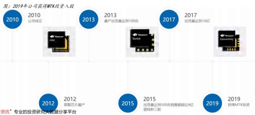 公司以射頻開(kāi)關(guān)、LNA芯片起家,實(shí)現 L先手機品牌如三星、小米、華為、vivo、OPPO等重點(diǎn)客戶(hù)覆蓋,并在2019年實(shí)現射 頻模組產(chǎn)品從無(wú)到有的突破。在細分產(chǎn)品中,比較優(yōu)勢明顯,射頻開(kāi)關(guān)已通過(guò)G通的小批 量試產(chǎn)驗證,正式進(jìn)入量產(chǎn)。DiFEM的成功研制是公司技術(shù)創(chuàng )新的又一里程 碑,打破了海外寡頭在射頻模組L域的壟斷局勢。站在當前時(shí)點(diǎn),公司營(yíng)收體量小,所處 賽道面向250億美元市場(chǎng),具備5G換機潮和射頻芯片國產(chǎn)替代的雙重彈性。