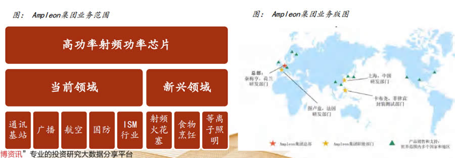 Ampleon集團原為著(zhù)名半導體企業(yè)NXP的射頻功率部門(mén),在射頻功率芯片行業(yè)擁有超過(guò) 50年的運營(yíng)經(jīng)驗,后經(jīng)剝離成立公司并由建廣資產(chǎn)成功競標。根據研究機構ABI Research 的統計,2016年Ampleon集團在射頻功率半導體行業(yè)的市場(chǎng)占有率為19.6%,排名D二。 公司的射頻功率芯片主要供應各大通訊基站設備制造商。Ampleon的經(jīng)營(yíng)模式介于IDM模式 與Fabless模式之間,其業(yè)務(wù)涵蓋射頻功率芯片的設計、封裝測試以及終的銷(xiāo)售環(huán)節,但 不包括晶圓采購、芯片制造及測試等中間環(huán)節。公司擁有Si LDMOS技術(shù)以及一代G端 半導體射頻氮化鎵技術(shù),GaN業(yè)務(wù)主要通過(guò)由晶圓廠(chǎng)商(UMS)代工的方式實(shí)現產(chǎn)品出貨。 公司基站芯片業(yè)務(wù)占業(yè)務(wù)總收入的88%。