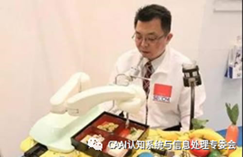 日本相關(guān)研究者開(kāi)發(fā)了一款喂食機器人,名叫“My Spoon”,殘疾人可以利用利用嘴巴、手或腳控制一個(gè)操作桿吃飯。機器人手臂前端裝有叉和勺子,能夠將食物自動(dòng)夾起,并送到操作者嘴邊。豆腐等軟性食品則可以用勺直接舀起,飯菜送到嘴前,上層的叉子還會(huì )感應縮回,不會(huì )傷到使用者的嘴巴,靠著(zhù)喂食機器,頸部以下癱瘓的病人、肢體不便的老人,也能自行進(jìn)食。
