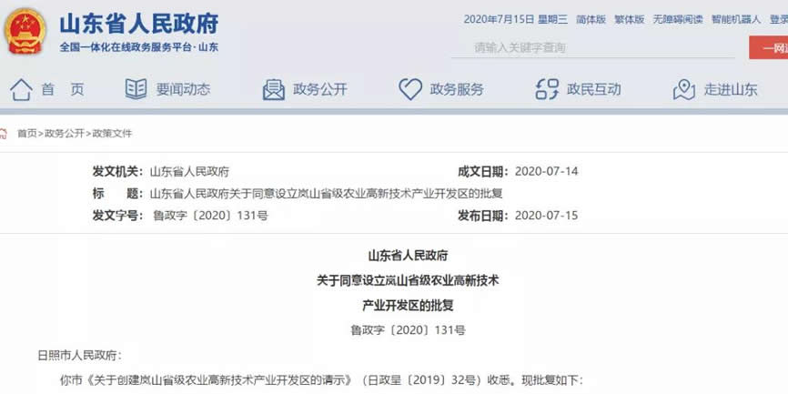 你市《關(guān)于創(chuàng )建嵐山省級農業(yè)G新技術(shù)產(chǎn)業(yè)開(kāi)發(fā)區的請示》(日政呈〔2019〕32號)收悉,F批復如下: