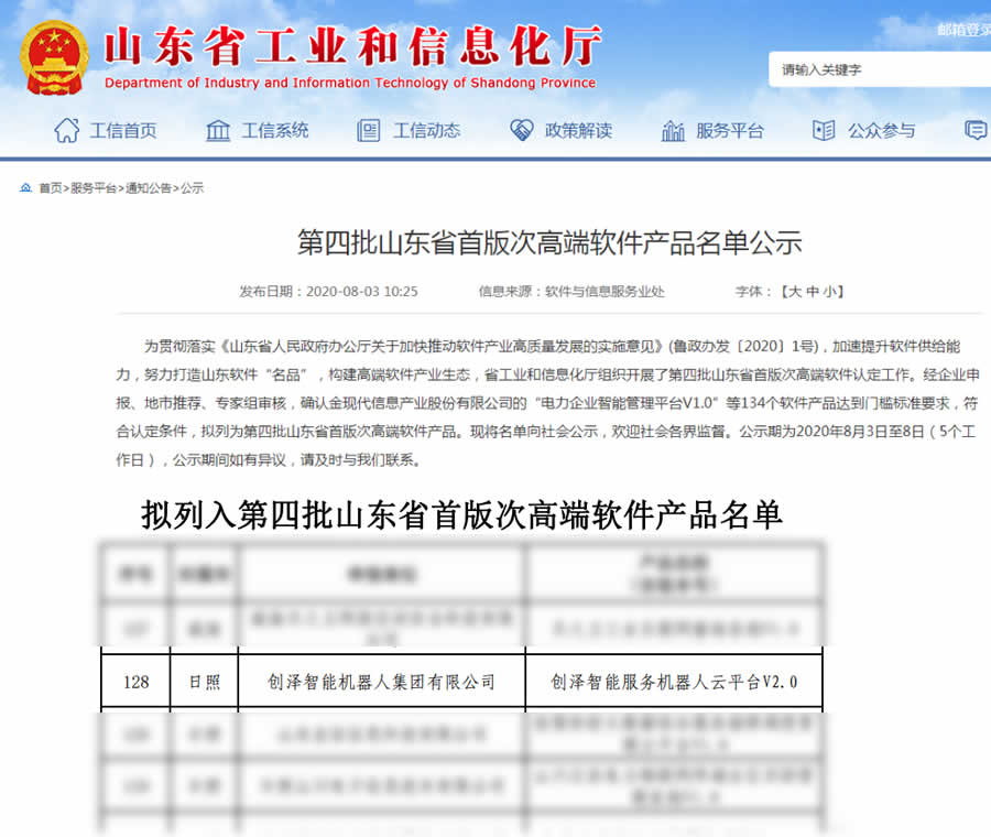 近日,省工業(yè)和信息化廳發(fā)布《山東省首版次G端軟件(第四批)公示名單》,創(chuàng )澤集團自主研發(fā)的“創(chuàng )澤智能服務(wù)機器人云平臺V2.0”等軟件產(chǎn)品成功入選。截至目前,創(chuàng )澤集團共有多款產(chǎn)品榮獲山東省首版次G端軟件產(chǎn)品。