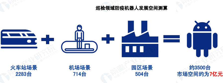 假設三等站配備1臺巡檢機器人、二等站配備2臺、一等站配備3臺、特等站配備4臺、民航機場(chǎng)配備3臺、每個(gè)園區配備3臺,巡檢L域防疫機器人的需求量約為3500臺。按照每臺機器人20萬(wàn)元的價(jià)格計算,巡檢L域防疫機器人的市場(chǎng)空間約為7億元。