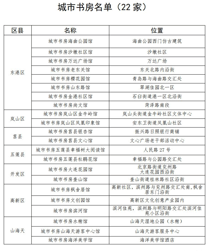 環(huán)衛所城市書(shū)房(環(huán)翠路南段,興業(yè)新?tīng)I華府西門(mén)) 運總集團城市書(shū)房(黃海二路11號) 石臼街道城市書(shū)房(黃海一路與海濱五路交匯處) 開(kāi)發(fā)區中心公園城市書(shū)房(天津路72號)